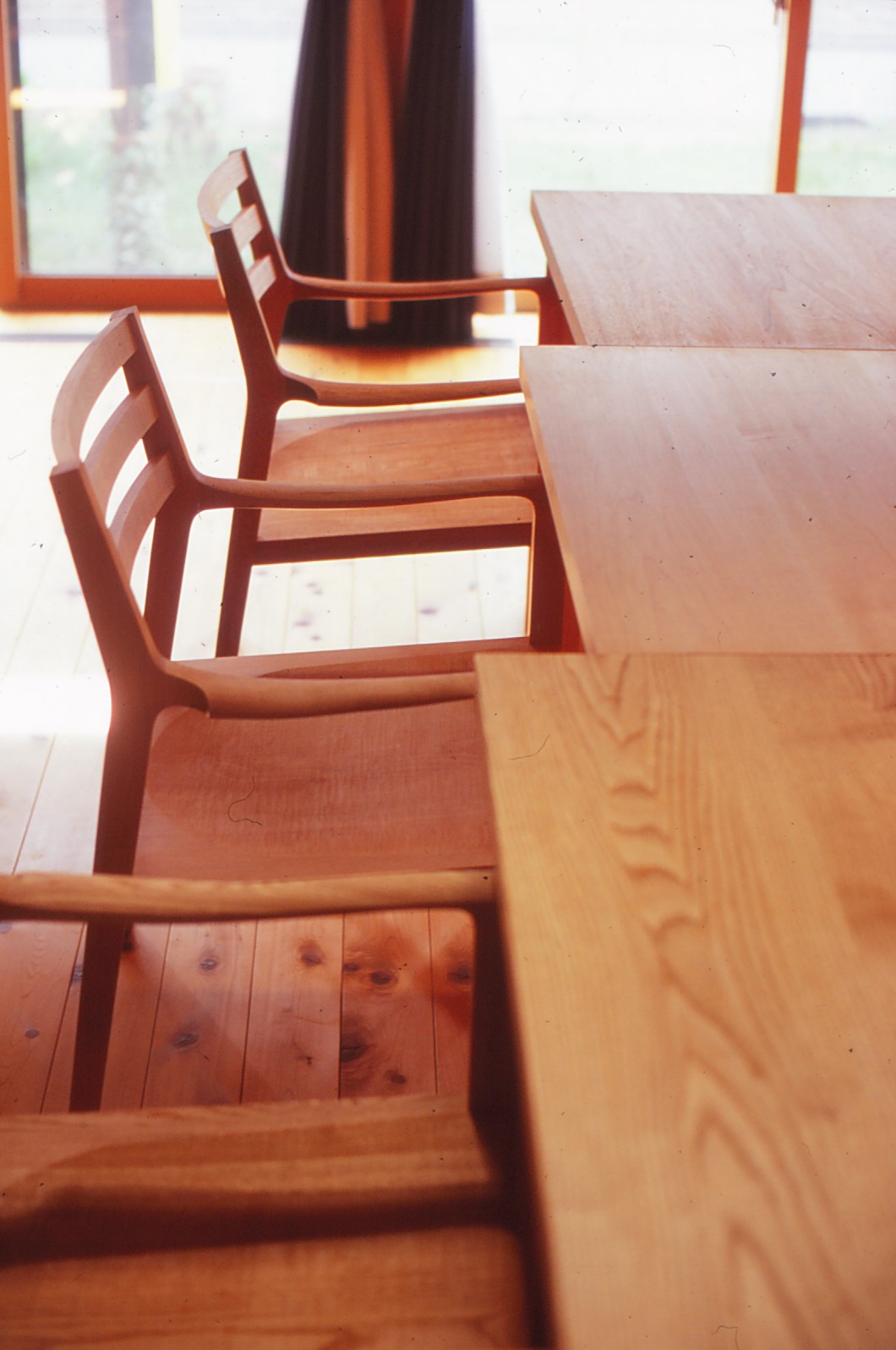 食卓とクルミ材のスピンドルチェア。